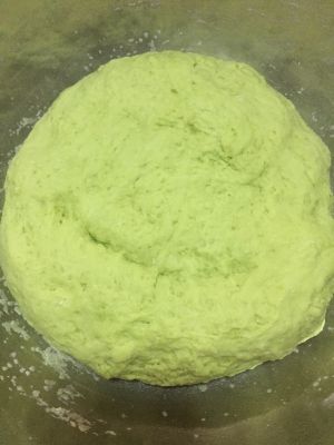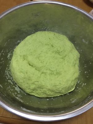 面粉,酵母粉,泡打粉,白砂糖,混合均匀,然后调入菠菜汁,揉成面团。