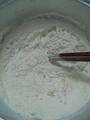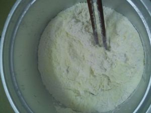 把奶粉和猪油加入面粉中搅拌