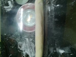 将面团搓成长条。表面轻压平一点。