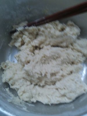 搅拌成图中的棉絮状态,就可以用手揉成一团。这种状态揉成的面团干湿度是正好的。 揉的过程中如果湿了一点,就撒一点点干面粉继续揉。如果面团干了就到一点点牛奶在手心继续揉。切不可一次加多了干粉或多了水份。