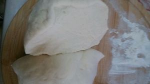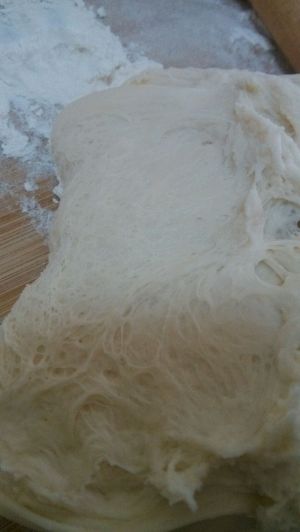 第一步先和面团,用面包机也可以。水要分次加,根据面粉的吸水量加入。