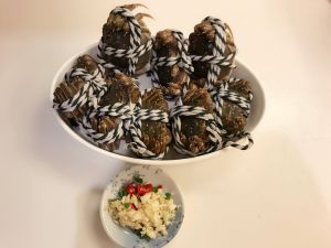 捆绑将大闸蟹的用水龙头上冲洗干净,葱蒜辣椒切末后放入小碗中
