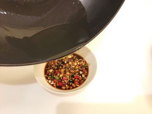 小碗再加少许陈醋和盐油。热锅把油烧热将油倒入碗中