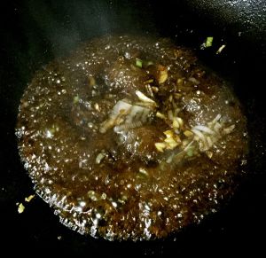 加入姜蒜爆香,加入生抽和老抽翻炒
