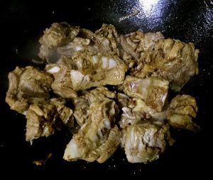 少许油,油热先放姜蒜炒两下放排骨炒几下放米酒酱油上色。