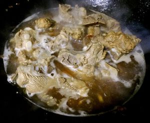 排骨倒入后加点生抽 料酒两匙 然后先前准备的材料一并入内 加入一勺开水 盖锅小火慢炖
