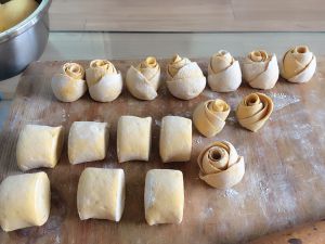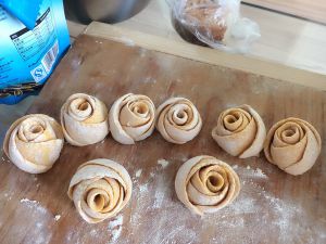 玫瑰花馒头是杆成饺子皮叠成一排由下往上卷中间切开整理后是开的花。刀切馒头是杆成厚5mm长方形然后卷紧切开就行了!