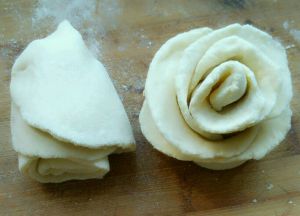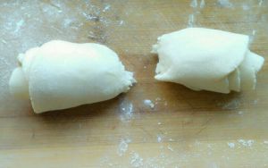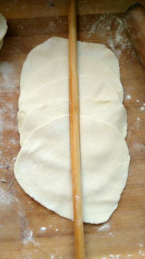 跟包饺子一样,分成小球,赶成片,但不能大溥,五个排起来,用筷子在中间压一下
