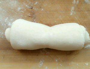 发好的面揉光,擀面杖擀成饼,然后放一起卷起来,切成小剂子