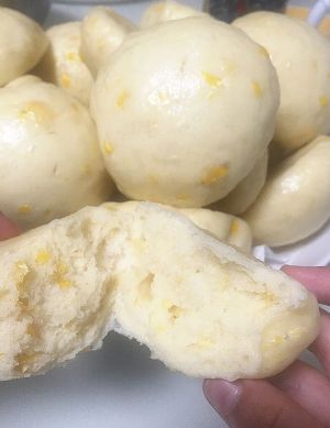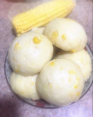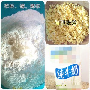 准备材料:以上“全家福”如图(面粉、酵母、糖、玉米粒切碎、牛奶)