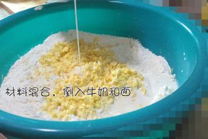 温水兑牛奶一点点倒入面盆中,用筷子搅成棉絮状,一直到盆里几乎没有干面粉就可以了