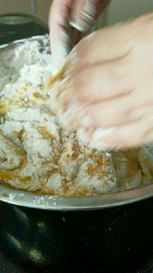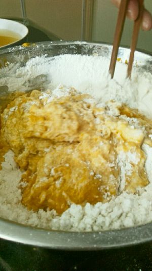 用搅拌机把混合好的面粉搅拌至棉絮状;
