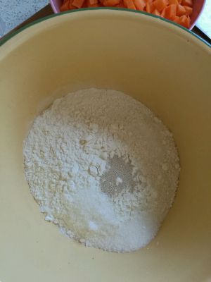 然后在胡萝卜泥中加入面粉、奶粉、白砂糖和干酵母,用筷子大致混合均匀。