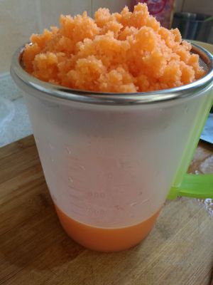 胡萝卜蒸熟后装入一个稍微大点的碗中,然后用擀面杖将其捣成泥状,如果有料理机的话也可以用料理机打碎。