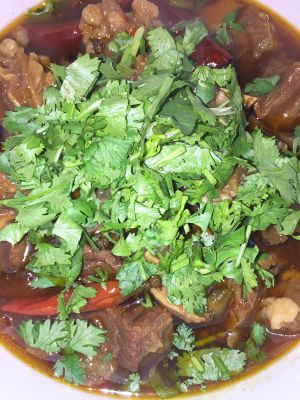 油爆炒牛腩,同时加入泡椒,豆瓣,花椒,大料,八角,老姜,盐,料酒。