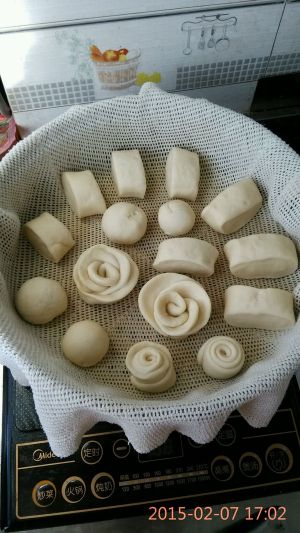 开花馒头粉,白糖混合倒入面包机,中间挖个小洞放入酵母,埋之,加温水揉面并发酵,8档,1小时30分。