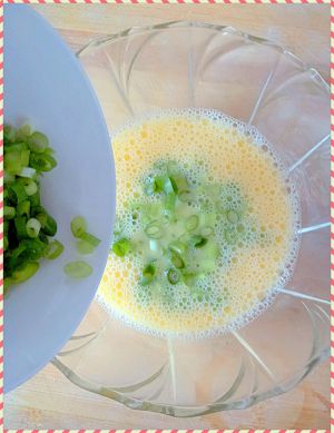 碗中打入鸡蛋,加入少许料酒打散后,放入香葱拌匀。