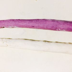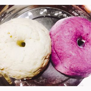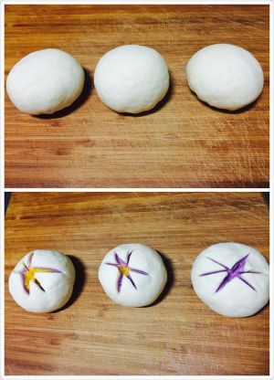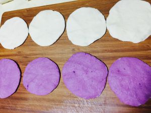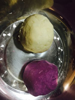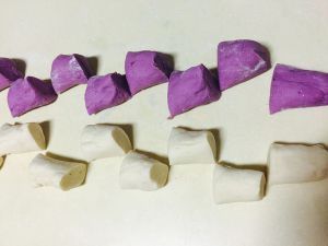 将南瓜和紫薯洗净削皮,切成小块或薄片,放蒸锅蒸熟(大约十二分钟),紫薯放至微温(约35度左右)加入2克酵母粉,再加200克面粉,如还干就加适量水搅拌成雪花状,与白面团相同,揉成光滑的紫色面团。