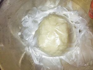 盖上保鲜膜(8月天气)室温发酵,见发酵至两倍大、并有许多蜂窝组织,手指沾干粉戳面团不回缩就发好了。