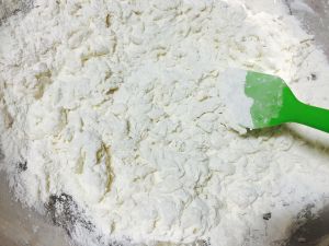 将白色面团分出60g,加入竹炭粉,揉到均匀,备用