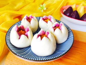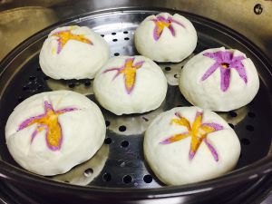 将紫薯泥和发酵粉 ,面和在一起,发酵后,做出各种样式