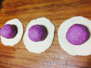 象包汤圆一样,包成紫面团,再用白色面片象包包子一样把紫面团包好。
