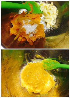 南瓜装入容器中,加入15克马苏里拉奶酪,加15克白糖、加少许面粉搅匀备用。