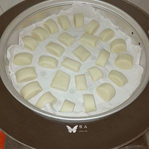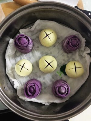 取蒸锅,加适量温水,同样不烫手的温度,将面团和面糊放蒸笼上隔水发酵半小时,发酵到原先的2倍大。