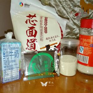 准备奶香层的食材,牛奶要温的(以不烫手为标准),将酵母和糖倒入牛奶中搅拌溶解,再将奶液倒入面粉中和面