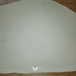 将发酵后的奶香面团揉成发酵前的体积大小,再擀成面饼,约2mm厚,再将面糊平铺在面饼上。