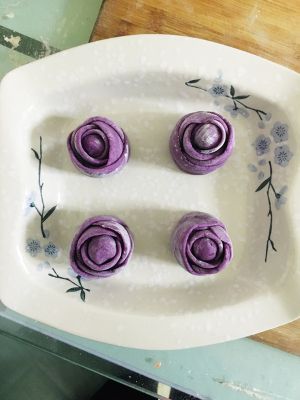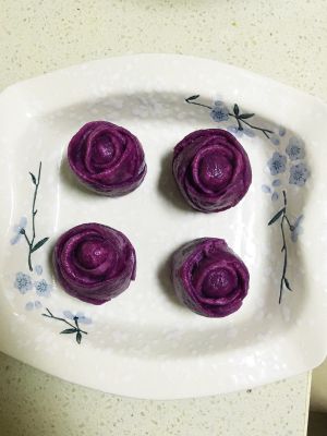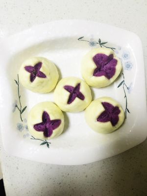 温水加入孝母,白糖熔化,到入面粉揉成一团,分一半加入碾碎紫薯揉均匀,