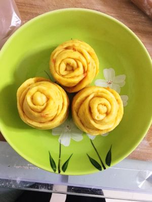 准备南瓜层的食材,南瓜需要蒸熟后捣碎,将酵母倒入南瓜中搅拌均匀再倒入面粉中拌匀。