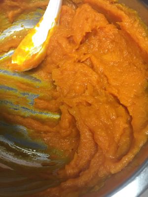 把蒸软的南瓜按压成泥,摊凉一点,因为酵母粉原因,不能太热了,可以下一步骤了