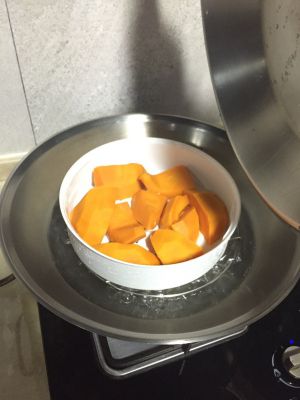 首先,把南瓜切块,放入蒸熟即可,用筷子戳,看是否蒸软,软了即可,出锅