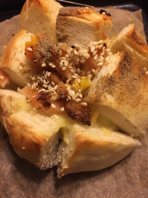 最上面匀匀的撒上椒盐粉和芝麻