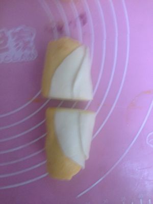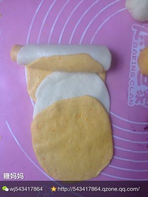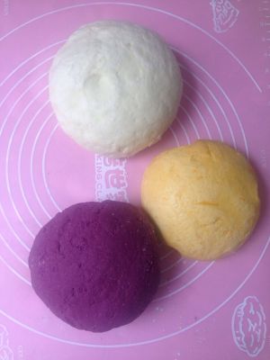 1.备齐所需材料,将150克南瓜泥和150克紫薯粉分别与300克面粉和三克糖,三克酵母粉,加适量牛奶揉成光滑的面团,剩下的四百克面粉单独加入适量牛奶和酵母粉揉成光滑的面团,然后放置温暖处发酵至两倍大。