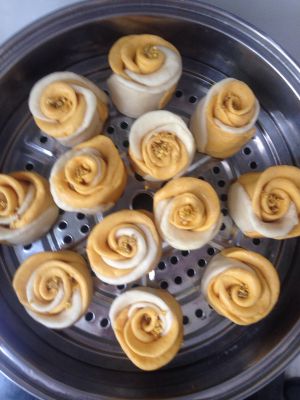 组合完毕。盖上锅盖醒发20分钟左右。冷水开蒸,上汽后转中小火蒸15分钟左右,再焖5分钟开锅。