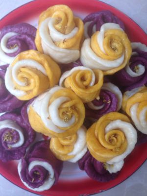 然后冷水上锅蒸12分钟,闷2分钟。在中间点缀椰蓉作为花芯。
