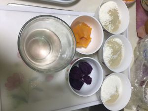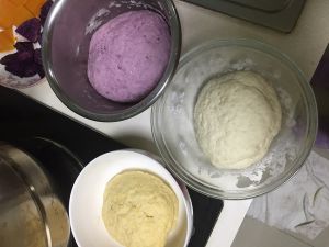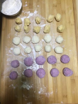 紫薯泥加入一份面粉,加40g水,揉成面团。南瓜泥加一份面粉揉成面团,剩余的一份面粉加50g温水揉成面团