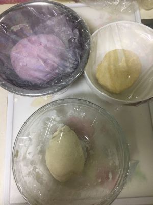 分别加入不同颜色色粉!和好面团,不用的用保鲜膜盖起来!