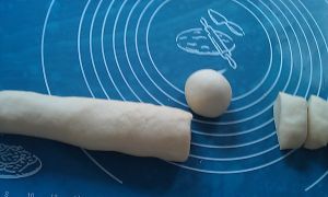 白色面团的一部分,揉好用擀面杖擀平,卷起来,切大李子那么大小一个剂子。拿起一个,揉圆,前部揉尖。