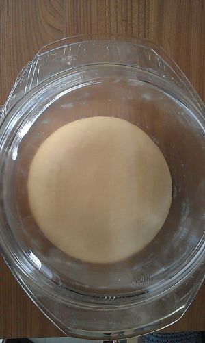 另外再准备一半分量,揉面团成型后,加点可可粉,2g就可以了,揉到颜色是咖啡色。也是盖保鲜膜,发酵。一个小时后,面团发酵好,拿出来揉去汽泡。