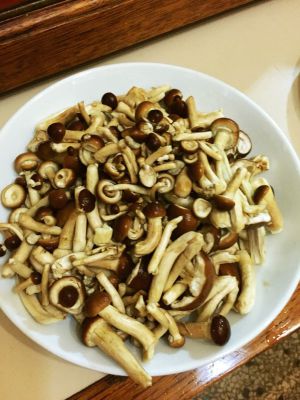等水开的时间清洗蟹味菇,剪掉底部黑黑的根,大个的四成小瓣。