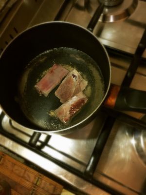 将排骨洗净,用料酒和盐腌制一会,然后焯烫一遍。冷水入锅的时候就把排骨放进去,直到水沸。这样一遍过来就可以把排骨的血水去掉,煮出的汤更鲜美。(因为家里人都不爱吃肉,所以只放了三块,就煮个味道,不然浪费了。)
