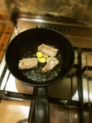 锅中倒入少许油,爆香姜片,入排骨煎。煎完一面翻另一面继续煎。