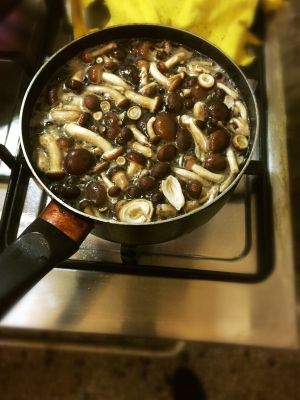 水开之后再多滚一会儿,让排骨煮的更入味一些。然后倒入洗好的蟹味菇,加盐,料酒,继续煮。