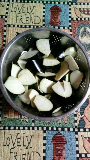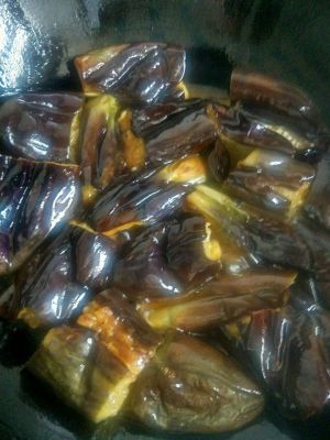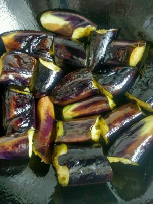 茄子掰成小段,油热放入锅内,小火候焖。直到茄子变软