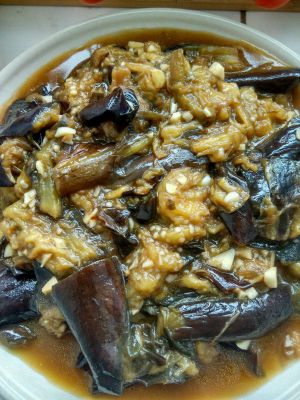 油烧热后加入大蒜碎及茄块改小火慢慢将茄块焙软,再加入蚝油、豆豉酱及少许盐翻炒均匀,再加入适量水小火慢炖5—8分钟,入味收汁后装盘即可。