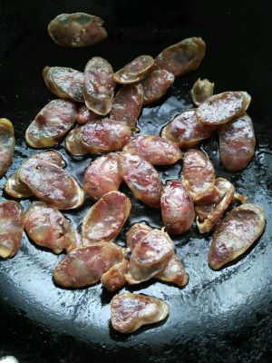 倒入腊肠,翻炒至出油,稍微有焦黄色即可,倒出碟子装好备用