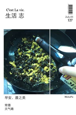 放木耳翻炒,翻炒木耳容易迸溅,请注意安全,一段时间后放入提前煎好的鸡蛋,再放盐继续翻炒,入味即可